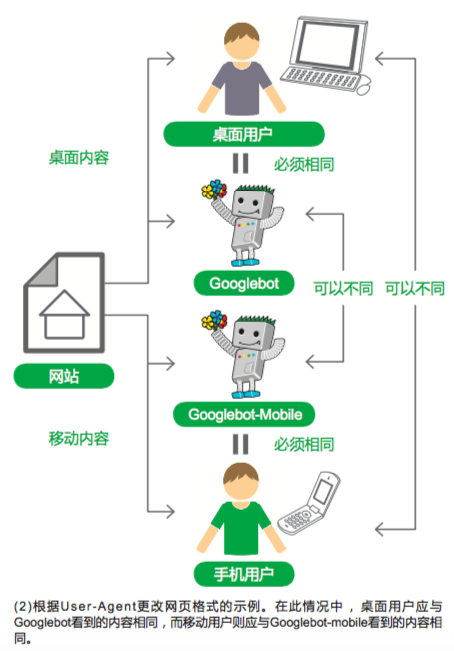Nếu cùng một URL được cung cấp hai phiên bản, chúng ta nên diễn giải “trang web hiển thị cho người dùng” như thế nào? Như tôi đã đề cập trước đó, Google sử dụng “Googlebot” cho tìm kiếm trên web và “Googlebot-Mobile” cho tìm kiếm trên thiết bị di động. Bạn nên gửi nội dung mà người dùng máy tính để bàn thông thường sẽ thấy đến Googlebot, và nội dung mà người dùng truy cập trang web thông qua trình duyệt trên thiết bị di động thông thường sẽ thấy đến Googlebot-Mobile. Điều này phù hợp với nguyên tắc của chúng tôi. Nội dung được gửi đến Googlebot và nội dung được gửi đến Googlebot-Mobile có thể khác nhau.