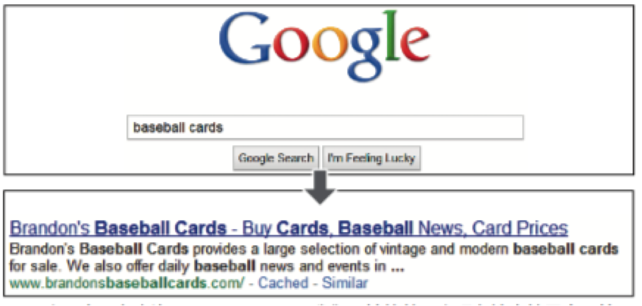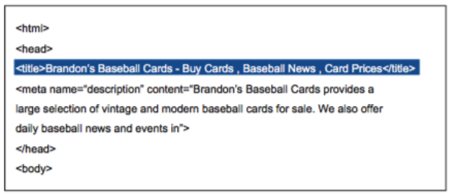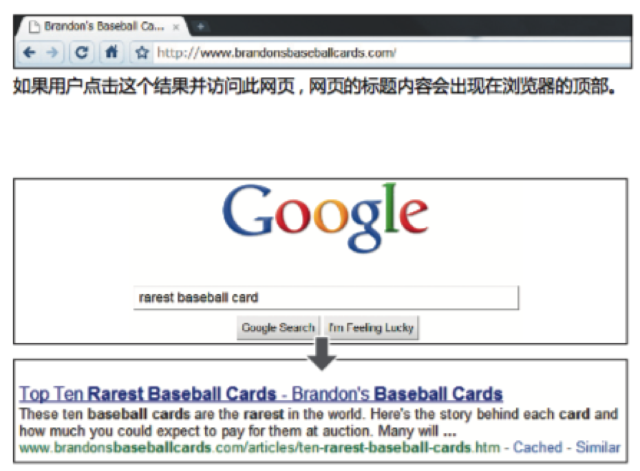 Nếu tài liệu của bạn xuất hiện trên trang kết quả tìm kiếm, nội dung thẻ tiêu đề thường sẽ xuất hiện ở dòng đầu tiên của kết quả tìm kiếm (nếu bạn chưa quen với các thành phần khác nhau của kết quả tìm kiếm trên Google, bạn có thể xem video phân tích kết quả tìm kiếm do kỹ sư Matt Cutts của Google trình bày, cũng như sơ đồ hữu ích này về trang kết quả tìm kiếm). Văn bản trong tiêu đề xuất hiện trong truy vấn tìm kiếm của người dùng sẽ được in đậm. Điều này giúp người dùng xác định xem trang có liên quan đến tìm kiếm của họ hay không.